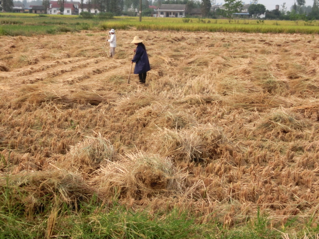 图为农民将晒干的稻草收拢准备打捆