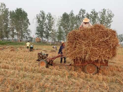 图为农民将晒干的稻草打捆上车综合利用