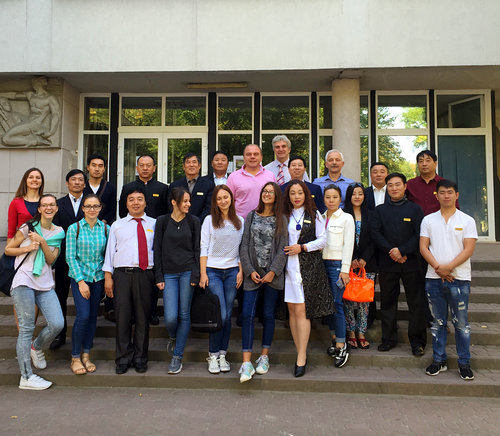 随后,代表团一行参观了建于1853年、具有悠久历史的利沃夫国立音乐学院。当代表团成员抬头看到音乐学院门前,为欢迎中国文化艺术-商贸之旅代表团准备-而悬挂着的五星红旗时,代表团所有成员一个个激动不已,纷纷争相在伟大祖国鲜艳的红旗下合影留念…据迎接陪同代表团参观考察的利沃夫国立音乐学院院长伊戈尔先生介绍,该院是乌克兰及中东欧最古老的国立音乐学院之一,比世界著名的奥地利维也纳大剧院的建成还要早10余年。音乐学院第一副院长米龙先生;分管国际关系的副院长奥斯塔普先生以及国立音乐学院各系主任;多位博士生导师;教授分别陪同中国客人参观并专门为中国代表团安排了丰富多彩的文艺节目。