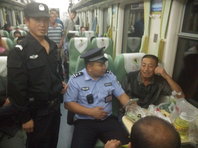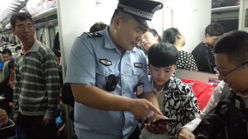 附图为:2016年9月21日,K1382次列车乘警在车厢向旅客宣传防手机诈骗知识
