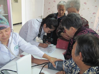 阿勒泰市金山路街道社区医院和文化路社区志愿者为老人服务