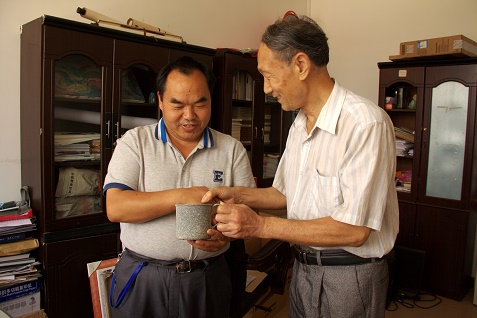 图为盛治久先生(右)将“红军杯”捐献给原黄平县史志专家潘世仁同志