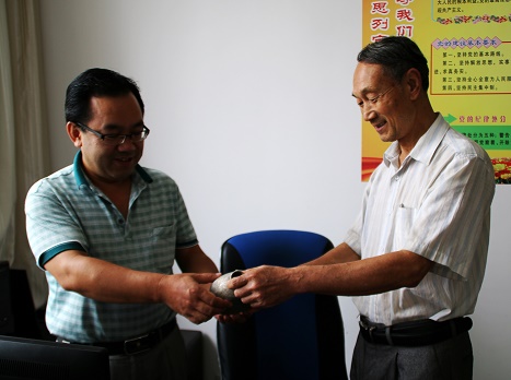 黄平县史志办主任刘治平在接受盛治久先生捐献的“长征壶”