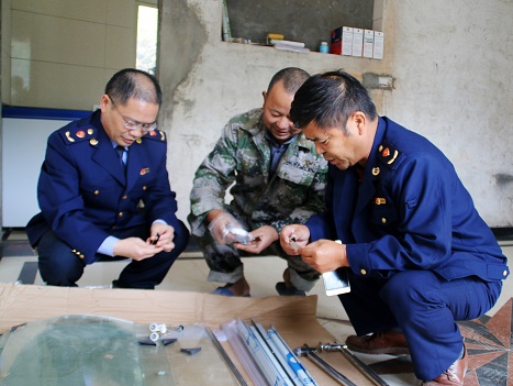 图为潘鹤程(左一)到农村受理群众消费投诉时查看的伪劣商品