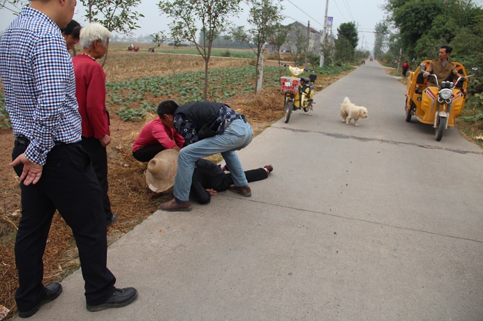 湖北当阳:八旬老太倒路边 大伙齐心来相救