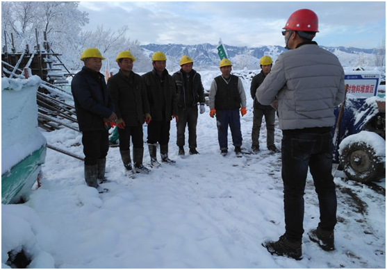 乱云低薄暮,急雪舞回风,银装素裹背景下的项目班前安全会更让人尊敬。工段长王振龙说:“风雨无阻,保证安全!近期天气情况比较恶劣,注意采取适当的保暖措施。大家到现场施工一定要注意劳动保护用品的正确佩戴,由于路滑,穿鞋子一定要穿防滑鞋。要戴手套,千万不可徒手施工。另外,新疆地区少数民族群众较多,一定要注意民族团结,和声和气交流,不可有伤害少数民族信仰的言谈举止!”