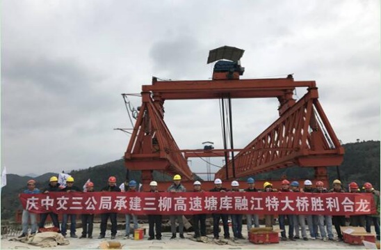 清风网讯∶(特约记者 常魁星 通讯员 张丽 祁云翠)“塘库融江架桥长,主跨悬壁现浇梁;感恩节时梁合龙,年底通车气势强。”11月24日,上午十一点三十分,随着最后一片T梁精准就位,广西三柳高速公路重点控制性工程—塘库融江特大桥胜利合龙,标着中交三公局三柳高速公路3标全线2696片梁板全部架设完成,3标主线桥梁实现全幅架通,是“百日大干”施工竞赛赢取的又一节点胜利,为年底通车奠定了坚实基础。