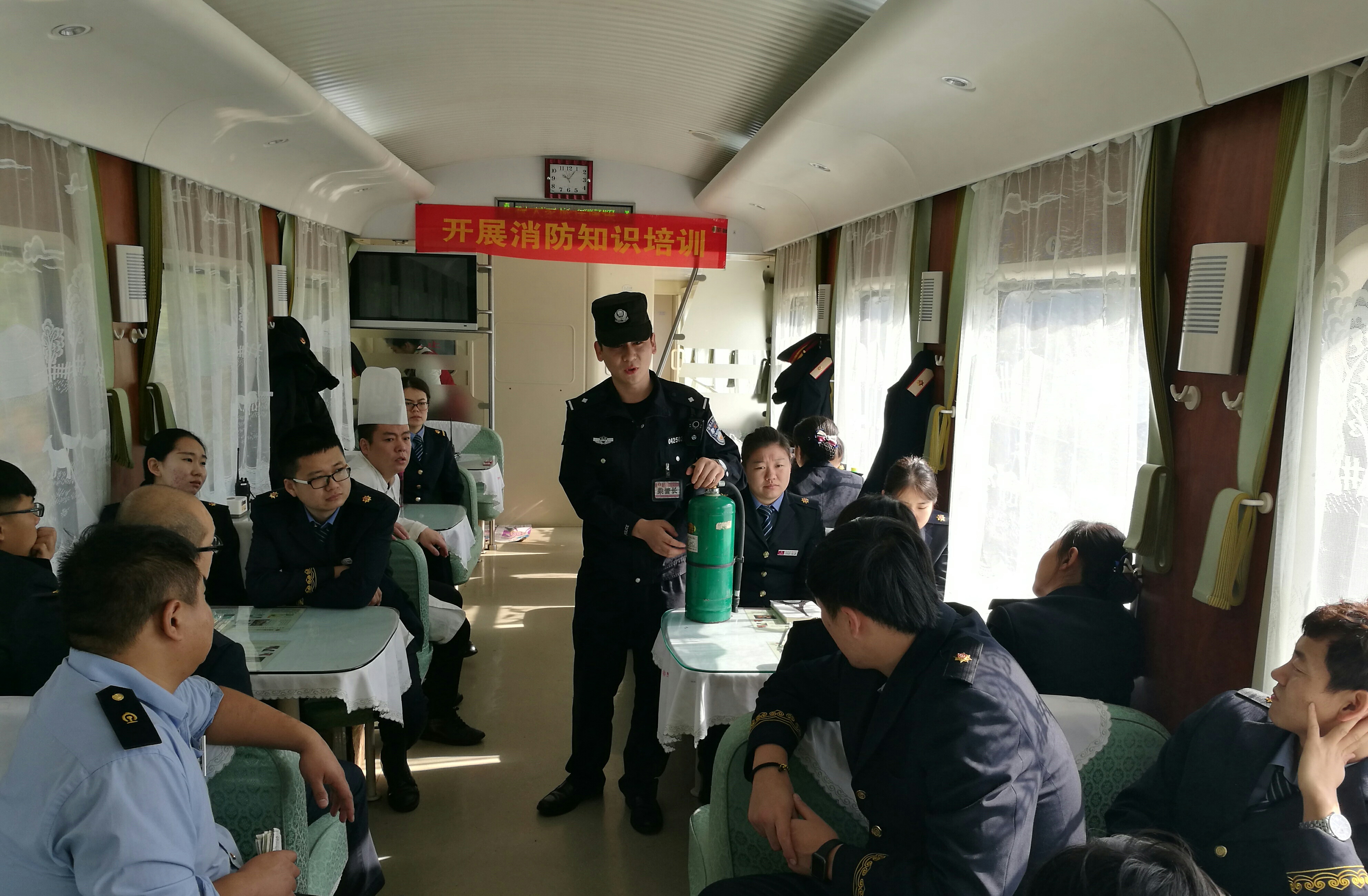 附图:11月29日,锡林浩特铁路公安处乘警支队Z336次旅客列车第五警组乘警长苏成勇向列车客运人员讲授灭火器使用知识