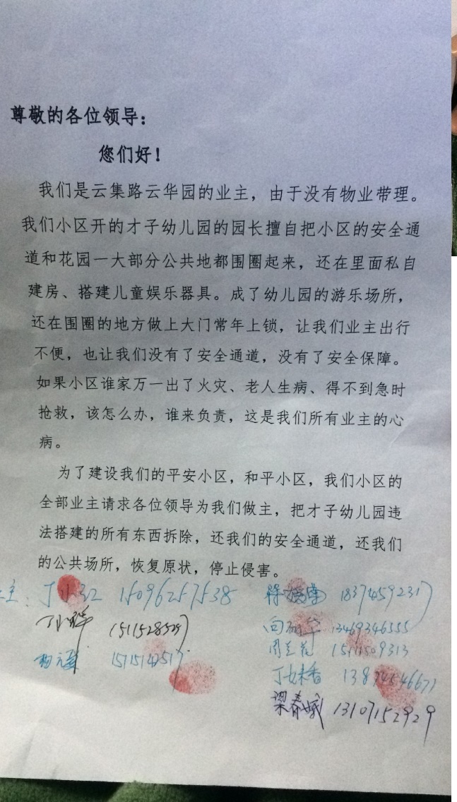 2016年11月10日锦溪社区云集路才子幼儿园内的业主不同意楼下幼儿园老板将消防通道占用,目前正在经过协商希望能达成一致。