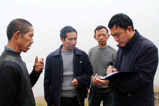 省水利厅驻谷陇镇“攻脱”联络员熊烈同志(左三)向媒体记者介绍实施苗族贫困户的脱贫战略
