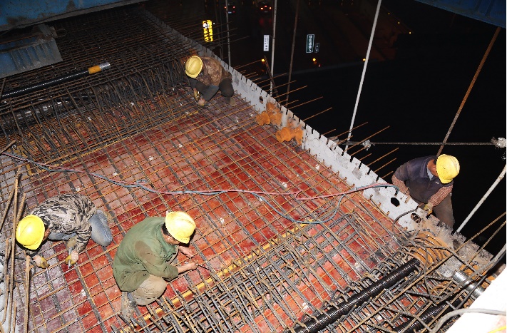 镜头二:20点39分,茅店镇赣县北收费站旁。在12米高的将军塘特大桥45号连续梁桥墩桥面上,4个钢筋工正在埋头绑扎连续梁节段块钢筋;在紧紧连着的44号桥墩上,几个焊工也在忙着焊接劲性骨架预埋钢料……;