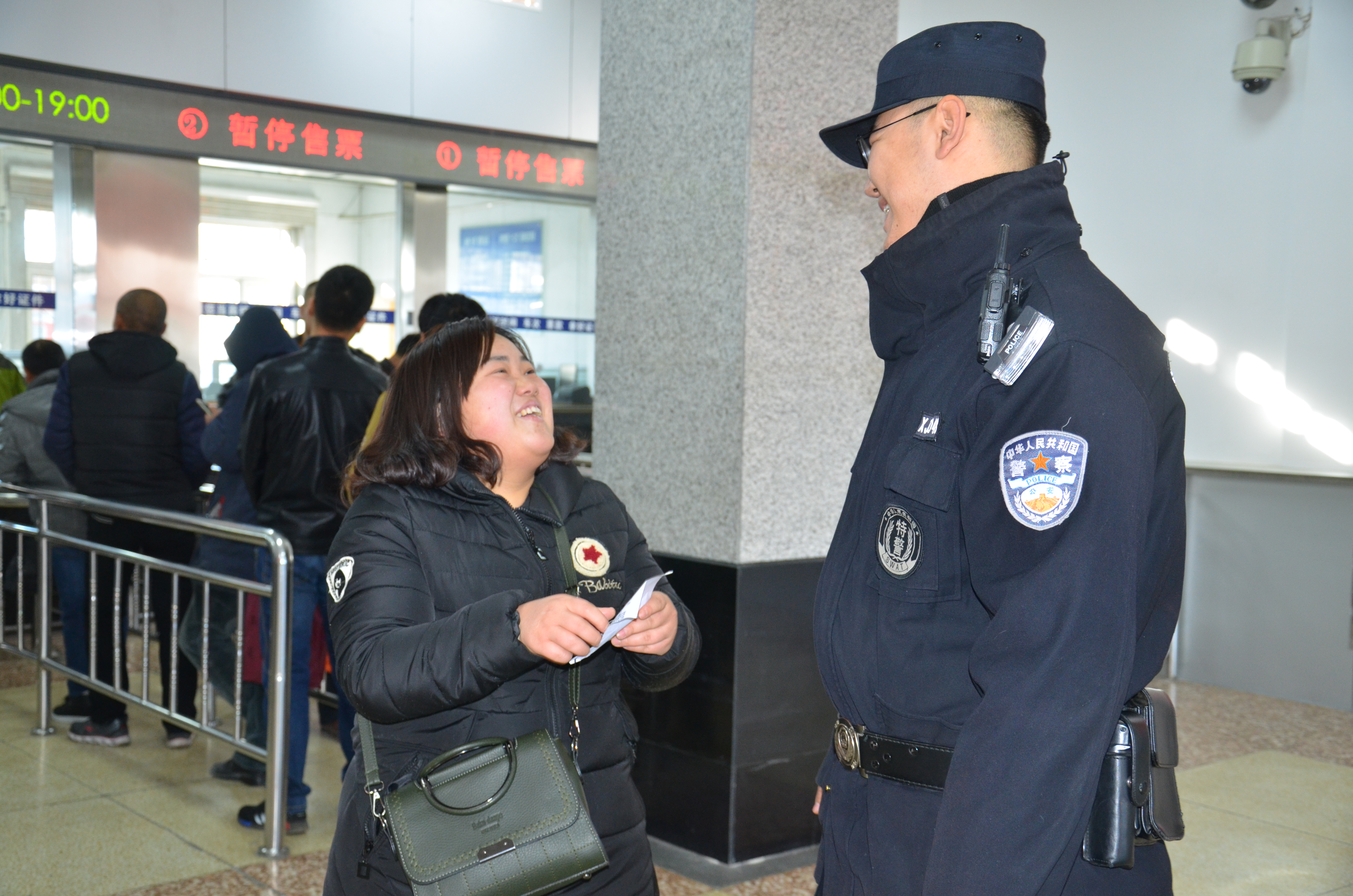 2017年春运首日火车票于12月15日开售。一大早,包头铁路公安处民警深入管内火车站,开展春运购票安全宣传活动。图为民警向旅客讲解如何购买真实火车票,如何避免购票骗局。