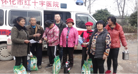 活动工作人员9点50赶到坪星村委会,在当地村委会的协助下马上建立好了义诊台,于10点5分开始为第一位村民开始了检查并在村民检查完后根据村委会提供的贫困名单为贫困户发放了大米和食用油等慰问品。检查开始办小时后,当刘书记听到社区汇报有一位对象李玉珍身体不便时,马上和医院院长带领工作人员赶往李玉珍家中,为其送去慰问物品和200元慰问金。红十字医院翁院长详细询问了老人的身体情况后,和社区工作人员一起将老人接到义诊点做更一步的详细检查。