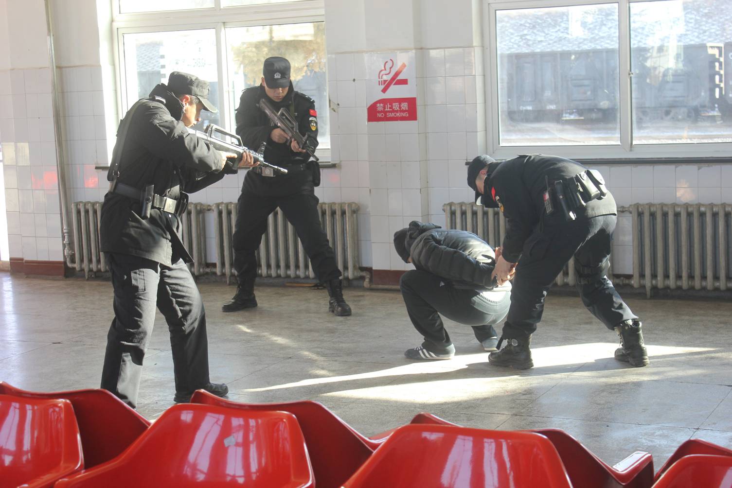 演练的模拟案例为暴恐分子手持菜刀、斧头等工具突然袭击站前广场群众并冲击候车室。派出所执勤民警与地方驻站特警立即进行处置,并及时向派出所及当地公安局报告请求警力支援,经路地警方努力及时将暴恐分子制服。同时结合演练情况进一步完善预案。演练中路地共出动警力20余名,警车3辆。通过演练进一步提升了路地协同配合及快速反应能力。