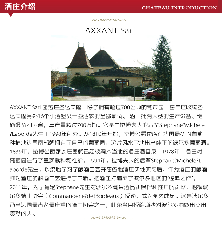 酒庄介绍 : AXXANT Sarl 座落在圣达美隆,除了拥有超过700公顷的葡萄园,每年还收购圣达美隆另外16个小酒堡及一些酒农的全部葡萄。 酒厂拥有大型的生产设备、储酒设备和酒窖,年产量超过700万瓶。它是由拉博夫人的后辈Stephane Michele Laborde先生于1998年创办。