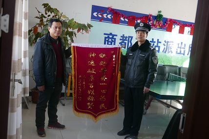 旅客为商都所送来一面锦旗。对商都所民警不辞辛劳,实实在在为人民服务表示非常感谢;对商都所民警们迅速受理案件,热情为旅客服务的态度称赞;对两公安处的无间隙合作,快速下达指令切实为旅客服务的态度表示感谢和赞扬。