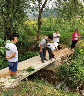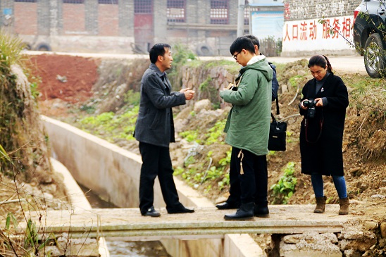 图为陈刚与技术员在对水利灌溉沟渠进行规划勘测