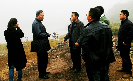 媒体记者终于在云雾环绕的万营山麓找到陈刚(中)采访