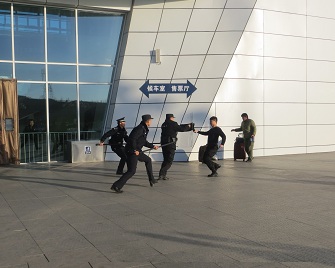 当日下午2点30分,一名持刀“暴徒”从东胜西火车站进站口向站内广场冲了进来,砍向正在进站的旅客,一名“旅客”受重伤倒地,接到警情后,铁路民警快速反应,利用防暴叉、盾牌、齐眉棍等警械向正在“行凶”的“暴徒”跑去,同时利用对讲机向上级指挥室报告警情,此时东胜区公安局特警大队、交警大队等民警前来增援,在通力配合下最终将“暴徒”控制,并将受伤旅客送往医院救治。此次演习共出动警力20余名,警车3辆,从控制“暴徒”到抢救伤者用时不到1分钟,通过联合演练进一步提升了路地协同配合及快速反应能力,并有效提升了现场处置能力。