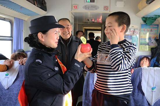 12月24日下午,由青岛开往包头的K711次列车上热闹非凡,原来是列车上的女乘警们采用趣味问答的形式为旅客讲解出行安全常识,并为旅客发放一个个色泽鲜艳的“平安果”。仔细一看,苹果上面还贴上了手写平安字样的心形标签。 “平安果”是由警花们精心挑选样子好看的红富士苹果,并手写制作的“平安”便利贴包装而成。“虽然派送的苹果的是有限的,但是希望通过我们的乘警工作,把平安带到每一名旅客身边”,乘警李文玉介绍说。