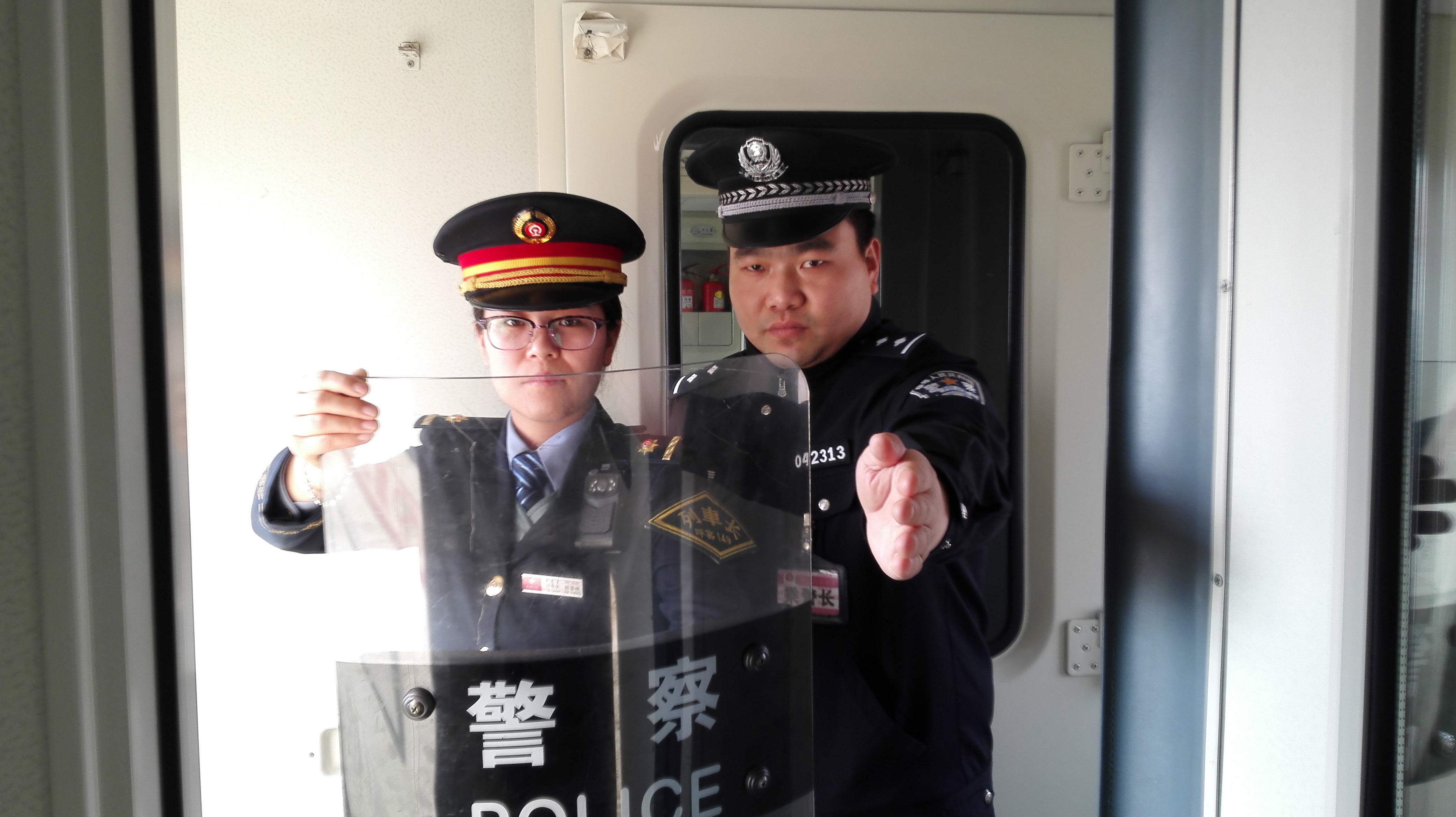 乘警长袁存雨教授列车长使用警用盾牌