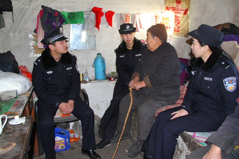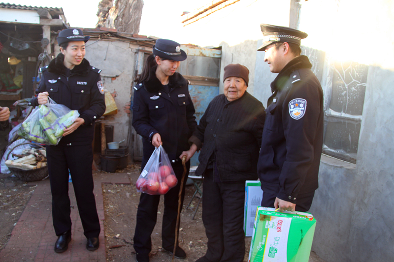 2017年1月1日,志愿者们冒着严寒来到住在半截店牧场的空巢老人季桂芝、赵祥家中,探望二位老人,不仅为老人送去了过节用的米、面、油、蔬菜水果等食品,志愿者们还主动为老人打扫卫生,询问老人身体状况和生活情况,与老人聊家常、谈生活,热情耐心地对老人进行心理咨询和心理疏导,帮助老人摆脱心理寂寞和精神孤独,使他们保持乐观健康的生活态度。朴实的老人感动得热泪盈眶,紧紧握住民警的手说道:“感谢孩子们,你们铁路警察真是我们的贴心人啊。”