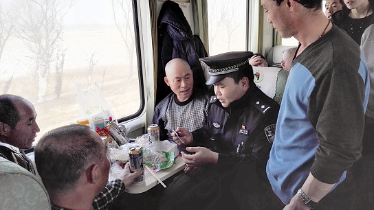 包头至哈尔滨的K1381/2次旅客列车是内蒙古自治区直达哈尔滨市的唯一一趟快速旅客列车,在始发站包头火车站,锡林浩特铁路公安处的乘警袁存雨等人早早地站在旅客列车旁,组织旅客有序上车,随后又分别进入每节车厢巡查,提醒“冰雕工”朋友把行李架上的物品放置牢靠,以免砸伤自己或他人。巡视中见到许多“冰雕工”把挎包挂在衣帽钩上、乱放手机等物品,警组2名民警都会不厌其烦地提醒他们取下放好,将财物置于自己视线范围内,以免发生被盗或丢失。