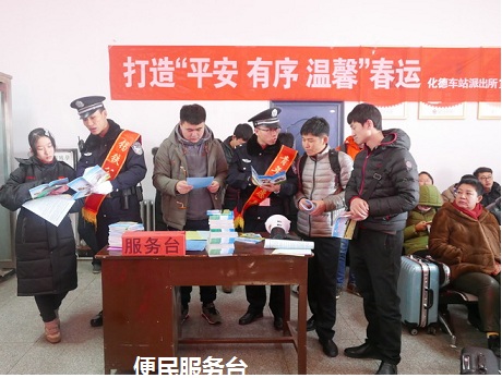 为确保春运期间旅客增加,旅客出行安全,化德所特设立青年民警服务小分队,深入广大旅客群众身边,通过设立便民服务台和微信公众号为旅客提供信息等方式,为旅客提供帮助。