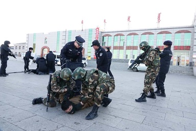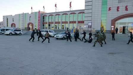 演练预设情景为2名男子在锡林浩特车站站前广场突然持刀疯狂的砍杀旅客,铁路公安值班民警通过视频监控发现后,立即通过对讲机呼叫值勤民警及值班辅警携带反恐装备赶往现场,同时上报所领导。铁路派出所立即启动反恐应急预案并且通报路地联勤办公室,锡林浩特市特警大队、武警锡盟支队与锡林铁路民警组成抓捕组共同前往现场进行处置,快速制服持刀行凶犯罪嫌疑人。期间,警组各司其职,相互配合,圆满的完成了反恐实战演练任务。