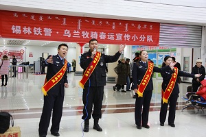 清风网讯:(锡林浩特铁路公安处 白瑜)为营造春运良好氛围,确保广大旅客平安出行,在春节来临之际,锡林浩特铁路公安处成立了“锡林铁警·乌兰牧骑”春运宣传小分队,深入沿线车站、旅客列车、牧户家中开展“铁警伴您平安行”文艺宣传。1月16日晚,“锡林铁警·乌兰牧骑”春运宣传小分队深入锡林浩特站开展以防盗防骗宣传、文艺互动演出、亲民便民服务等内容的宣传活动,努力营造“平安、有序、温馨”的春运氛围。