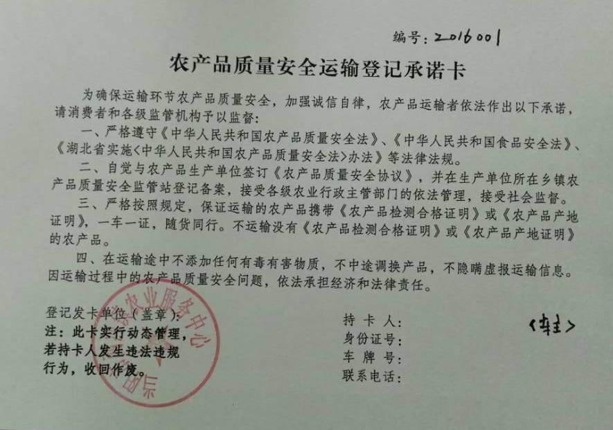 《农产品质量安全运输登记承诺卡》要求运输农产品的车主,必须遵守农产品质量安全的有关法律法规,与生产单位签订《农产品质量安全协议》书,保证运输的农产品携带《农产品检测合格证明》、《农产品产地证明》,在运输途中不添加任何有毒物质等,否则将依法承担经济和法律责任。经过对农产品运输环节的监管介入,现全镇各农产品经纪人均实行了只有持有《农产品质量安全运输登记承诺卡》的车辆,才能承担其农产品的运输业务。