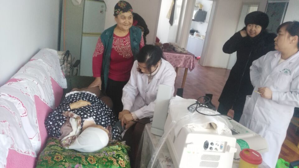74岁的吐汗和100岁的孜来汗的两位夫妇家是这次服务的第一站。吐汗由于多年患有糖尿病、高血压、类风湿疾病,现今膝关节疼痛,生活不能自理。孜来汗由于高血压、心脏、两腿类风湿疾病出不了门,本以为要错过这次体检,没想到医院领导听说后决定上门为他们做各种检查,这让老两口很高兴。