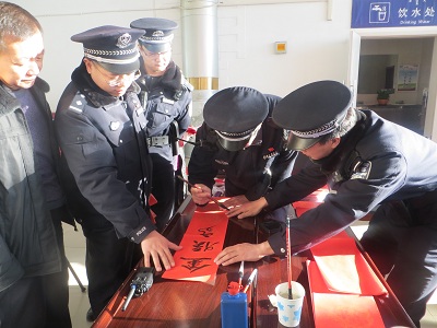 临河车站派出所民警王文武、巴市书法协会的4位书法家参与了当天的活动,怀着对人民群众的深厚感情,他们悬腕屏息,挥洒而书,笔风或遒劲有力或清爽洒脱,一幅幅散发着墨汁香味的春联很快展现在大家的面前。“金猴高升辞旧岁,户雄鸡报晓迎春来”、“ 平安是福福星照,百顺为祥祥满堂”……这些火红的精美春联映衬出浓浓的节日气氛,也满含着民警们诚挚的祝愿。旅客们纷纷驻足,争相领取,顷刻之间现场就被围得水泄不通。