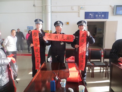 在短短的2个多小时里,共书写春联100余副,旅客们拿着代表平安、祝福的春联,听着民警们关于防骗防盗、出行提示的宣传,带着祝福踏上归途。