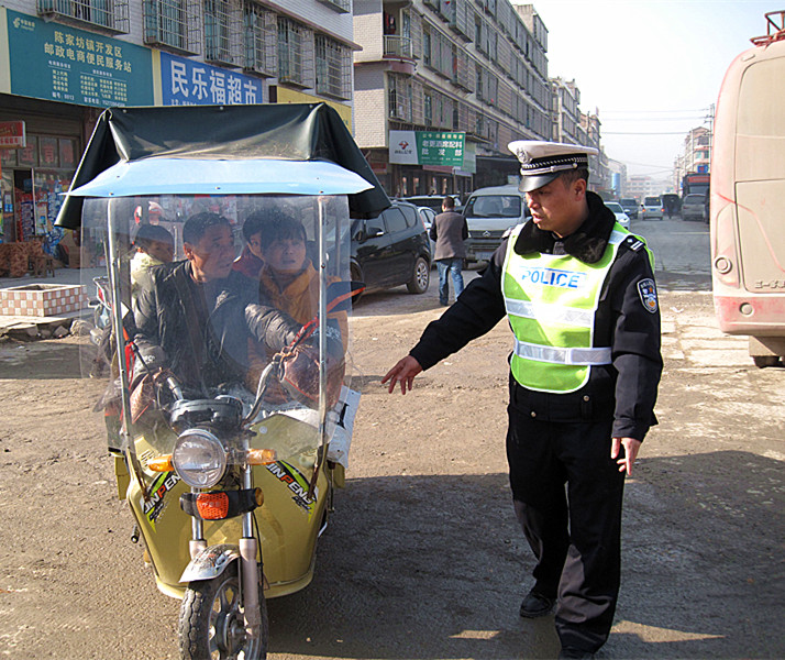 执法人员在检查非法运行的三轮摩托车