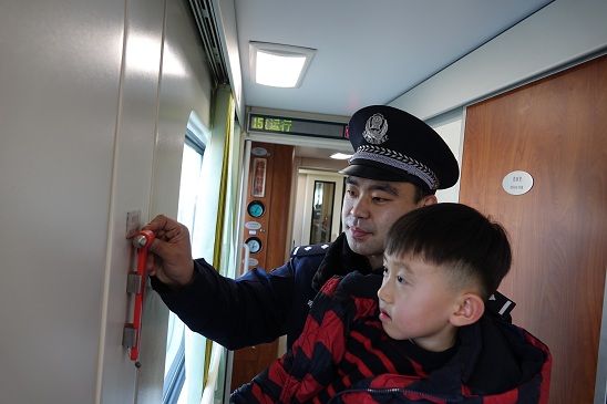 1月25日,Z336次旅客列车乘警在向娃娃乘客讲述消防锤的使用。