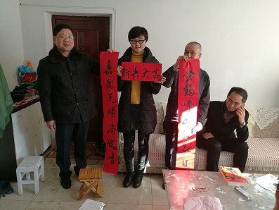 备份栏目清风网讯:(通讯员 李淑琴) 一声声问候温暖人心,一声声祝福传递深情。1月24日,文化路社区及共驻共建单位阿勒泰地区食品药品监督管理局的领导来到贫困居民家中开展走访慰问活动,为他们送去新年的问候和祝福,还有社区老党员专门为居民写的“迎新春,送祝福”的对联。