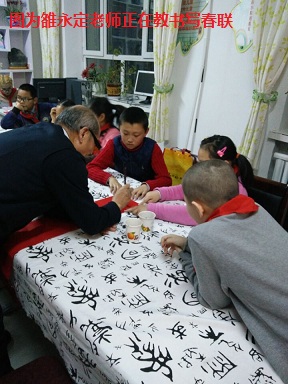雒永定老师教小朋友们蘸好笔墨,凝神聚气,毛笔蘸足了墨,落在喜气洋洋的红纸上,一幅幅带着喜气的春联增添了“年味儿”。此次活动让孩子们感受到传统文化的魅力,让中华民族毛笔字文化在青少年一代得到传承和发扬。小书法爱好者石睿同学高兴的说:参加了这次活动,我更加喜欢写毛笔字书法了。
