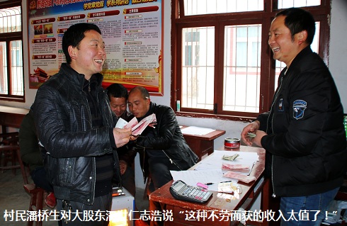 清风网讯:(特约记者 廖尚刚)随着“三变改革”在黄平县的借鉴和运行,该县野洞河镇下坝村6户村民去年首次以“三变”的胆识,入股盛和养殖合作社后,1月24日,每户股民从大股东潘志浩手上领到了一叠厚厚的红包,村民潘桥生激动地说:“这种不劳而获的收入太值了!”
