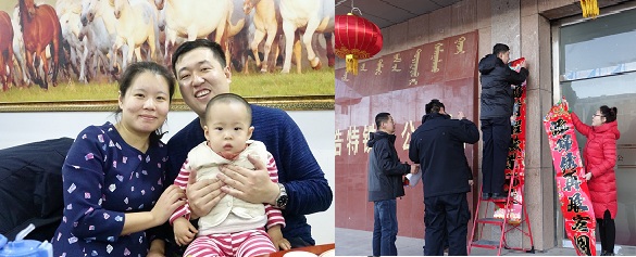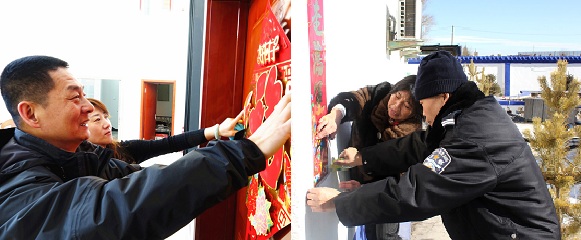 民警与家属携手在明亮窗户上贴上窗花,在门口张贴春联,红红的灯笼在夜色里照亮盈盈一团的热闹节日氛围。可爱的孩子们在家属怀中眨巴着好奇的眼睛望着身旁的人,望着如糖果般甜蜜蜜的环境。