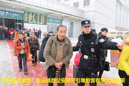 包头铁警以雪为令,加强巡逻,扶老携幼,积极开展“学雷锋、做好事、助他人”活动。针对旅客列车客流量较大的情况,及时调整警力全警动员,维护旅客乘降秩序。在严格岗位责任落实的基础上,积极清除积雪,不断穿梭在广场、候车室等地。每名民警都带着十二分的热情,尽力为旅客提供帮助。实现了恶劣天气“安全出行、方便出行、温馨出行”的目标,受到广大旅客的一致好评。