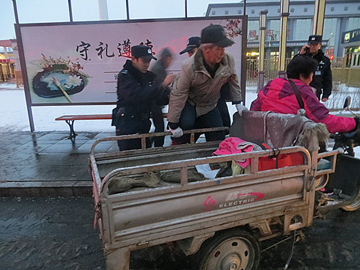 “大爷,我们扶着您吧,小心滑倒……”民警关切的对老人说道。随后,一名民警立即跑出站外核实老人家人的位置,并告知放心,其他民警变查缉验证通道为绿色通道,将老人缓步搀扶到家人早已准备好的三轮车上。看着脸冻得红扑扑的几个年轻小伙子,老人和他的家人将满心的激动化为六个字“感谢,感谢警察!”。