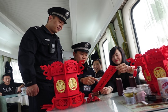 “上车切记看管好自己的物品”,“防止顺手牵羊上车时刻提高警惕性”,“谨防浑水摸鱼上车放置行李要注意,防‘上架子’ ”,“新型犯罪要注意,伪基站让人难分真假”,“谈话中要防‘上托儿’”,“乘车一定要看好自己的孩子,防拐骗”。一张张由乘警亲手写出温馨的乘车安全提示,让元宵佳节乘车的旅客倍感亲切。