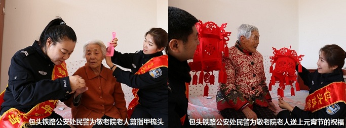 “老吾老以及人之老”,据包头东站派出所副所长魏强介绍,今年是他们与包头市博爱敬老院建立帮扶共建机制的第5个年头。每到逢年过节,同事们都会相约一起到敬老院服务,为老人们送去水果、牛奶等慰问品,与护理人员擦桌椅、洗衣服,陪老人下棋、聊天,与老人们结下了深厚的情谊。“元宵节是一个团圆的节日,能够把这份团圆的喜悦气氛带给敬老院的老人们,让我们民警也觉得十分快乐”。