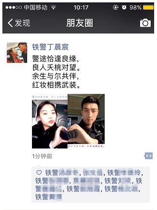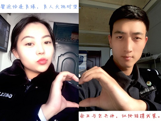 2月14号这天,李宏伟正在上班,突然接到女朋友的电话,让他摆个奇怪的pose拍个照,小李虽然疑惑,但也不敢不“从命”,拍完发过去刚没一会儿,他刷新朋友圈看见女朋友发了一张拼合过的图片,仔细一看,原来小丁让他摆的pose只是一半,手势刚好和女朋友自己拍的照片合起来是一个心形,这张特殊的“合照”还附有一首小诗:“警途恰逢良缘,良人夭桃对望。余生与尔共伴,红妆相携武装。”小李心头瞬间涌上一股暖意,给女朋友发消息:“谢谢你亲爱的,情人节快乐。很抱歉不能常在你身边,今天不能陪你过节,可我们还有一生的时间相伴。警路结伴成双,伊人在山一方。与卿相恋二载,武装伴汝红妆。”
