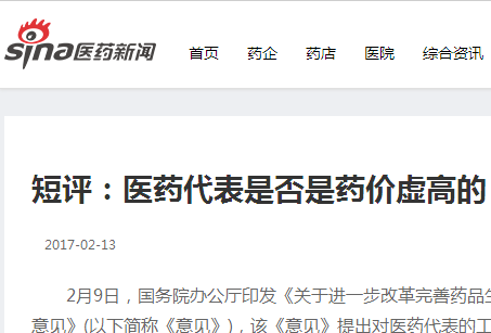 备份栏目2月9日,国务院办公厅印发《关于进一步改革完善药品生产流通使用政策的若干意见》(以下简称《意见》),该《意见》提出对医药代表的工作范围、工作内容的限制要求,还要加大处罚成本,违规人员将会被拉入失信黑名单,这一新规或与外界舆论相近,认为将全国约200万名医药代表控制好就会把药价降下来,医药代表到底是不是药价被抬高的“刽子手”....
