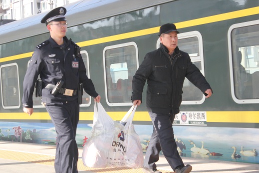 支队全体乘务民警广泛开展送温暖、送平安、送法律、送服务的“四送”活动,从身边的点滴小事做起,民警组织旅客有序上下车,帮助旅客拿大件行李物品、搀扶大龄旅客上下车让寒冷中的旅客感受到了温暖,体会到了温情。此外,乘警们积极为旅客献爱心,为旅客提供法律咨询服务,耐心解答旅客提出的各种法律知识问题;利用列车广播和口头的形式进行安全旅行的宣传,并在旅客中发放乘警大队自行编印的《安全乘车小常识》。民警们忙碌的身影、热情的言语充分体现出铁路公安民警心系旅客、关爱群众、热情服务的精。