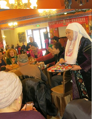 活动第一项共唱一首歌:俗话说“五十六个民族五十六朵花,五十六个民族是一家。”这句话正点明了我们中华民族五十六个民族团结又友爱,社区全体干部们合唱的《爱我中华》,我们请来了尊贵的客人,要有“恰秀”,以示对客人的尊重和欢迎,一般都由年纪较大的人来抛撒糖果、八道巷社区居民库丽孜帕爱心妈妈的恰秀,送来了节日的祝福。