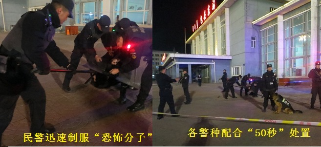深夜23时12分,包头东火车站派出所内气氛严肃紧张,监控中“恐怖分子”持刀冲入验证口对旅客及工作人员进行砍杀,被迅速发现的铁路民警、铁警和地方公安当即制服,盾挡、约束、击倒、按压、夺刀、上铐一气呵成,没有给“恐怖分子”任何可乘之机,旁观旅客发出阵阵喝彩,一旁显眼的位置立着一块牌子,写着“正在演练”。