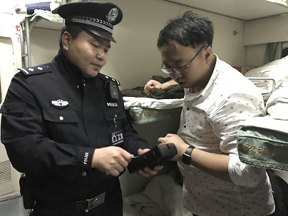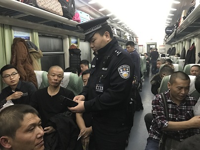 3月3日,“两会”首日锡林浩特公安处乘警支队对其值乘的“过京”Z296次旅客列车进行查缉比对工作。